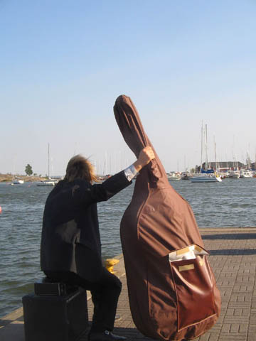 I took this photo at what moviemakers call 'Magic Hour', just before sunset. The musician, like my girlfriend and me, was waiting for a ferry to take him to one of the nearby islands. We were going to dinner; he was going to work.