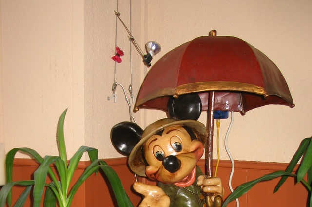 Manon already told you last week of her purchase of a statue of Mickey Mouse in a jungle outfit. Well as this picture shows she found a fitting environment for him: the jungle of plants in our living room.