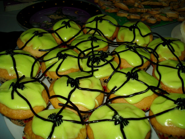 My guests thought I was playing a trick on them with my version of the 'spider web cupcake platter'! The web is made of licorice, the spiders are made of plastic and the green ghouly icing was achieved using the right combination of yellow and green food coloring. To make your own follow these instructions.