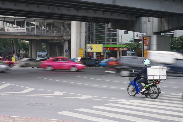 Traffic in Bangkok. All the cabs have bright colors like pink, yellow, green, blue and orange so you can spot them from miles away.
