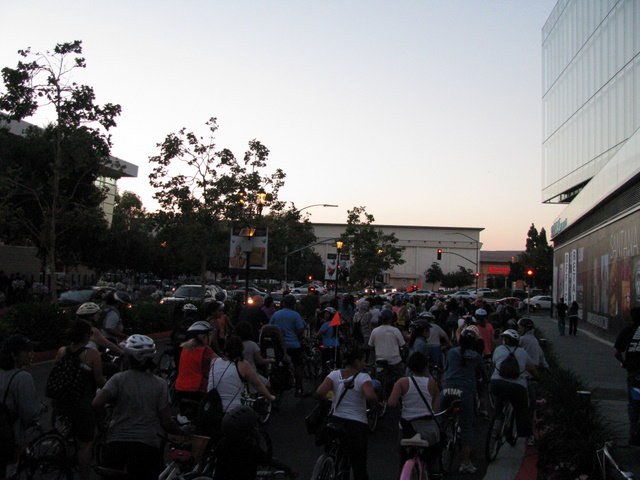 Every third Friday of the Month the San Jose Bike Party throws a bicycle party in the San Jose (CA) area. I heard last time there were 3,000! bicyclists cruising the streets. This bike ride always starts at 8PM, start and route rotate every month.