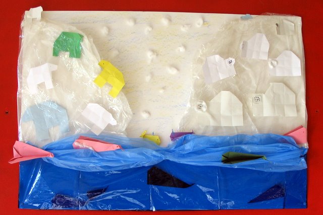 What to do with the folded ice bears, whales and igloos of the youngest? Make a nice collage of two ice bergs and the sea.