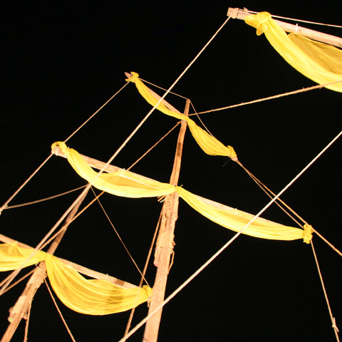 poles and ropes. It is a large square rigged ship, built during a sea scout camp last summer. After sunset the ship was illuminated which gave this fairy-like picture.
