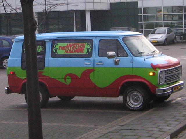 The next day, this van appeared in the parking lot. Four teenagers and a big dog came out, looked around for "clues", and soon caught the ghost, whom they unmasked as Mr Jenkins, the grumpy janitor, who was working some insurance scheme. God bless those youngsters and their Great Dane.