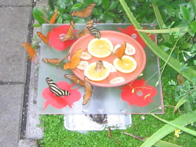These exotic butterflies, living in a greenhouse in the botanical gardens of Amsterdam, look like they're having lunch.