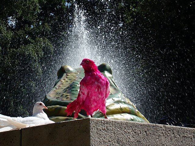 The pigeons used to be manually painted every few weeks. But since that was outlawed, they now take a colorful bath every so often. It's the least they can do to be the star of this show.
