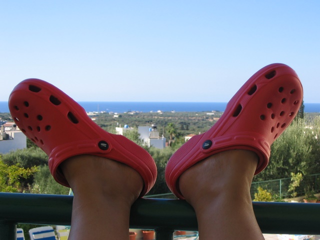 Yes! Finally I have those ugly Crocs too. That's not entirely true, I have Reefs. But they look very Croc-like, feel the same and were a lot cheaper (hey, I'm Dutch ;) In the Netherlands a pair of Crocs cost 40 euros, I bought my Reefs on Crete for 11 euros. And still I feel ripped-off. The next day I saw Reefs for only 5 euros. They didn't have 'my' catchy cerise ones, but still...