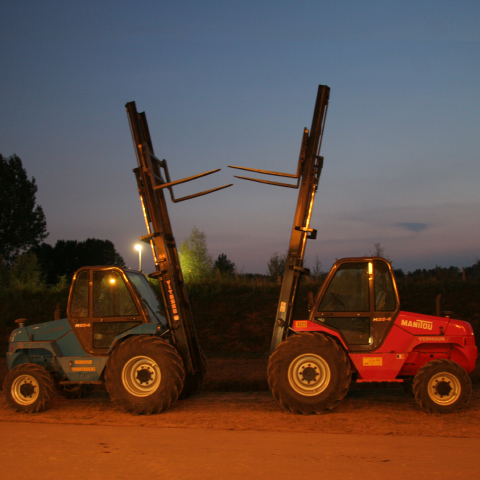 Two rough terrain forklifts having sweet dreams after a good day of hard work.