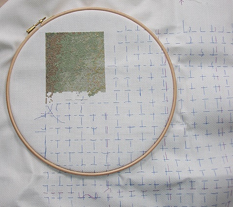 My Aida-cloth is too large to cross stitch it by hand. I tried, but after a two thousand stitches or so I gave up. So I finally bought a hoop to taut the cloth. That's better, but do I feel like an old lady. (hush, don't tell them I take of my glasses when I start stitching, that makes me feel even older).