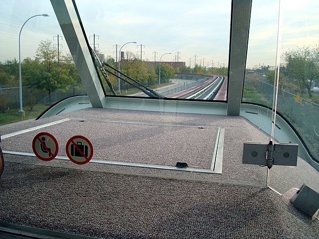 This is the chauffeurless monorail train that circles around "Liberty International" airport in Newark (near New York). Although a cart that doesn't require a driver sounds ideal, I must say that I have seen better driving. It accelerates a lot -and in short bursts- only to then step on the breaks.