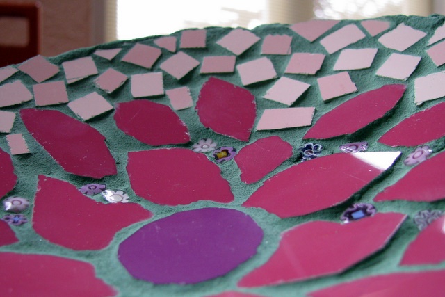It was fun to grout the tesserae (fancy word for all the pieces in a mosaic). As I didn't have a grout wedge, I cut one of my silicone cake cases -which I never used anyway- to spread the grout across the tesserae. After letting it dry for a few minutes, I cleaned the mosaic with a wet sponge and saw something beatiful appear through the 'mud'.