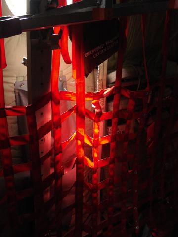 Taken inside an American airplane at the Air Force Open House days. I just thought it was nice, the way the light fell through the red net and mind the detail: the emergency passenger oxygen system pack.