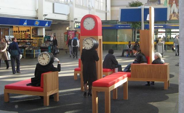 When a new set of comfortable benches was introduced in the hall of our train station, two people wearing large clocks for heads made an appearance.