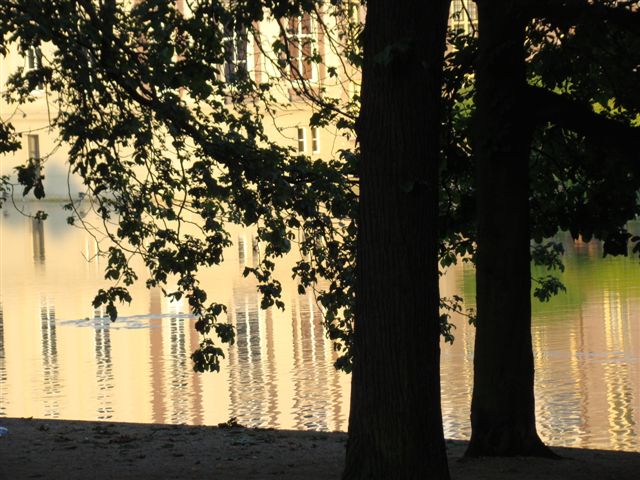 Just a sunny day in town. I was struck not only by the trees in back light, but also by the way the light hits the water and the shows bright reflections of the buildings.