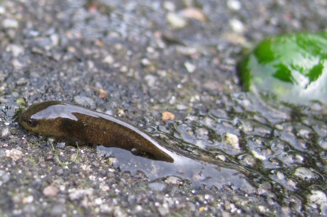 Now this is one of the reasons why I encountered a stressed female Lissotriton vulgaris (at least I think it is a female): a very tiny, stranded salamander.