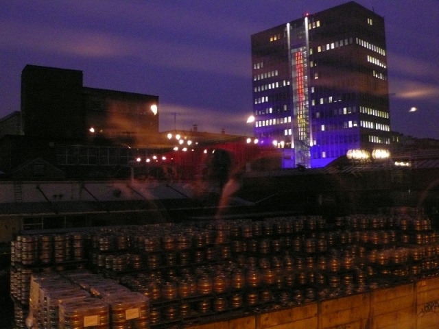 After enjoying a dusty tour through a beer brewer's paradise, we walked up the stairs to find ourselves surrounded by beer-drinking humans. Clasping a goblet of beer I peered through the window hoping to escape the sight of it all when I was confronted with the sight of stacked beer tanks...quite a view.