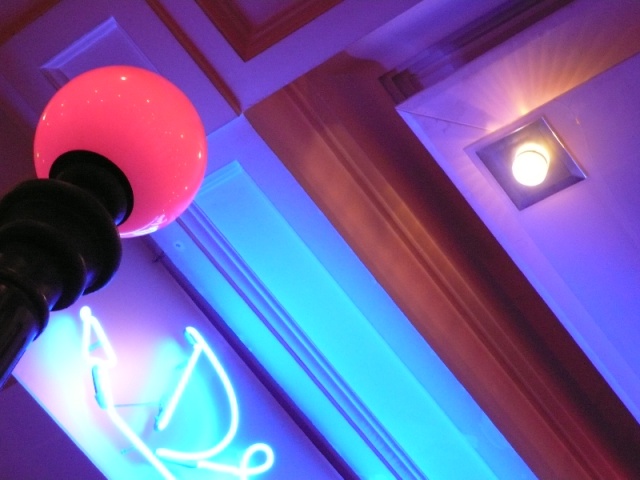 Amidst the people, a crowd can be quite asphyxiating. When there's no way out I turn towards a ceiling and usually end up seeing interesting things, as in this combination of neon lights. It's almost poetic, the way the lights "kiss" the ceiling. Once this shot was taken I realized I stood alone, the crowd long gone...
