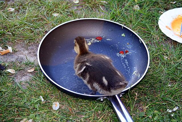 Now is this duckling eating the remains of our last meal? Or is he preparing to be our next?