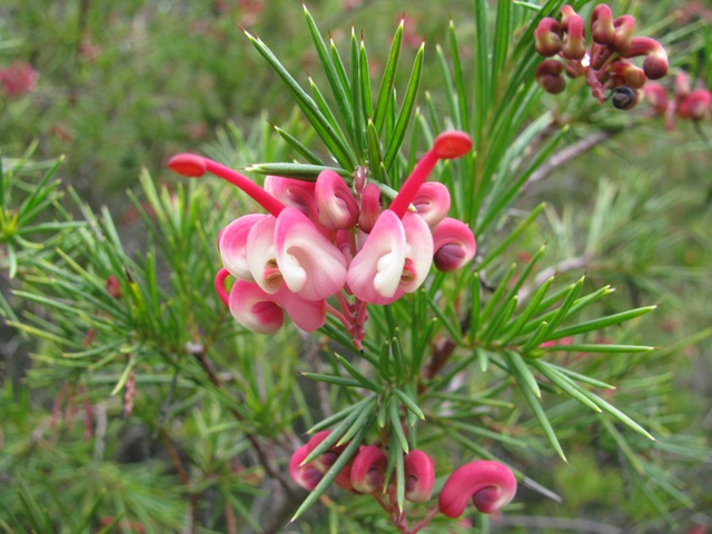 I first thought this was a honeysuckle, but the leaves are too needle-like. Is it a kind of broom? After a search on Google with the keywords 'Pink flower needles shrub', I stumbled on the Grevillea. They do have the distinct 'antennas', so this might be a good match.
