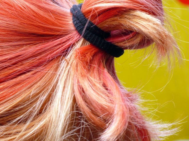 Long strands of hair, twisted into different directions. Up and down and cork-screw all the way through the "hair-constrictor" , jolting out at the end. Stubborn hair going its own way as usual.