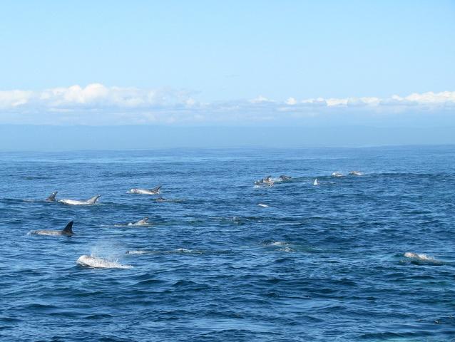 When we took Frank's parents on a whalewatching trip last week, we got the idea it was a slow day. We 'only' saw two humpback whales and six dolphins. But when we headed back to the harbor, we came across a big group of dolphins. It was a mix of four different kinds: Risso's dolphins, Dall's porpoises, Northern right whale dolpins and Pacific white-sided dolphins. We counted about eighty, awesome!