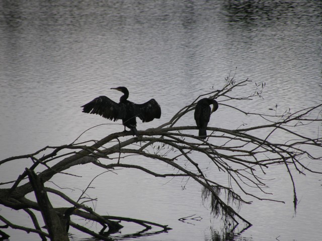Three cormorants resting on this branch in the water after a good flight and swim they had to dry and polish there feathers.