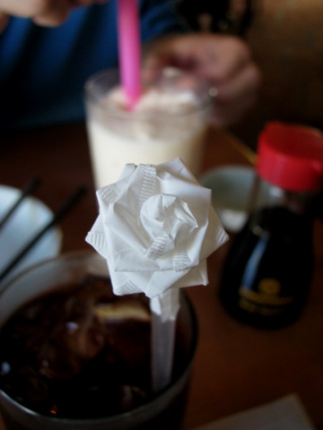 Now this is a cute rose made of a straw wrapper. I immediately unfolded it to see how it was done. Couldn't put it back together of course, so I googled it. The closest instruction I could find was this video with an annoying little helper 'assisting' her mother. They use a crepe streamer but it should work with a straw wrapper too.